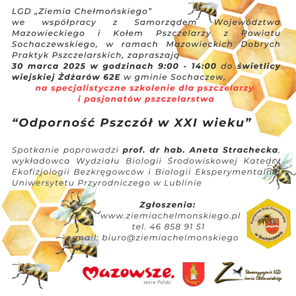 Stowarzyszenie LGD Ziemia Chełmońskiego zaprasza 30 marca 2025 r. do Świetlicy Wiejskiej w Żdżarowie na specjalistyczne szkolenie pt. „Odporność Pszczół w XXI wieku” dla posiadaczy pasiek i pasjonatów pszczelarstwa w ramach Mazowieckich Dobrych Praktyk Pszczelarskich